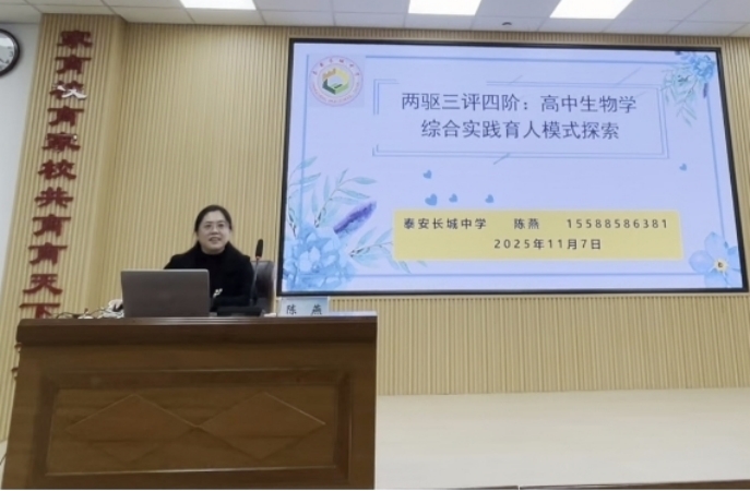 近日,山东省“数字化赋能教师专业发展”行动省级专家现场跟进指导活动在烟台经济技术开发区高级中学顺利举办。泰安长城中学生物教研组长陈燕老师受邀参会,以《两驱三评四阶:高中生物学综合实践育人模式探索》为题作专题经验分享,全方位展现了我校生物学科基地在实践育人领域的创新路径与丰硕成效。