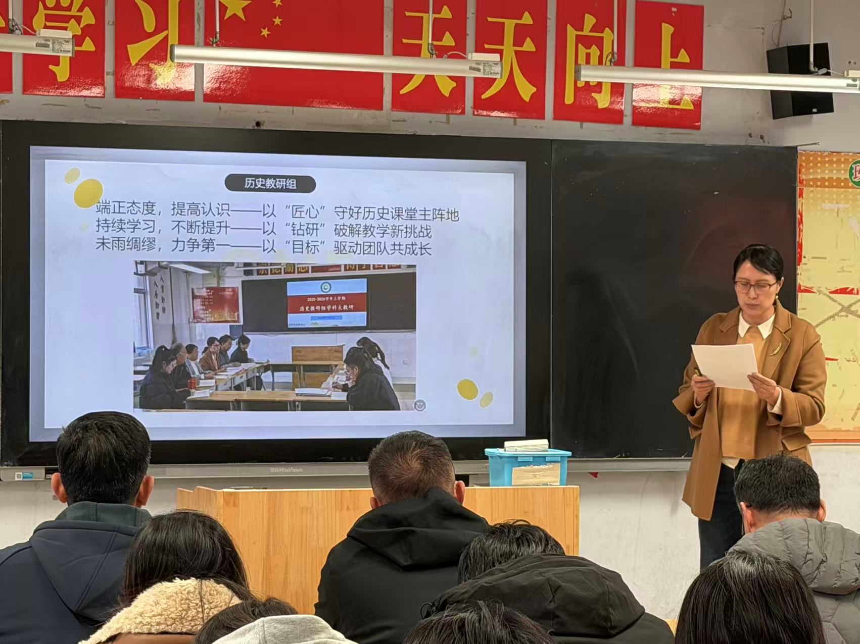 语文、历史、物理三位备课组长从学科建设的角度进行了深度分享。语文组高飞老师强调围绕早读、课堂、作业和作文四大环节,用实招来抓落实,用细功求质量;历史组马敏老师从深化集体教研、提升关键能力、落实学科素养等角度分享了备考经验;物理组郭脉波老师则聚焦学生思维训练与实验探究能力,提出了一系列创新教学举措。