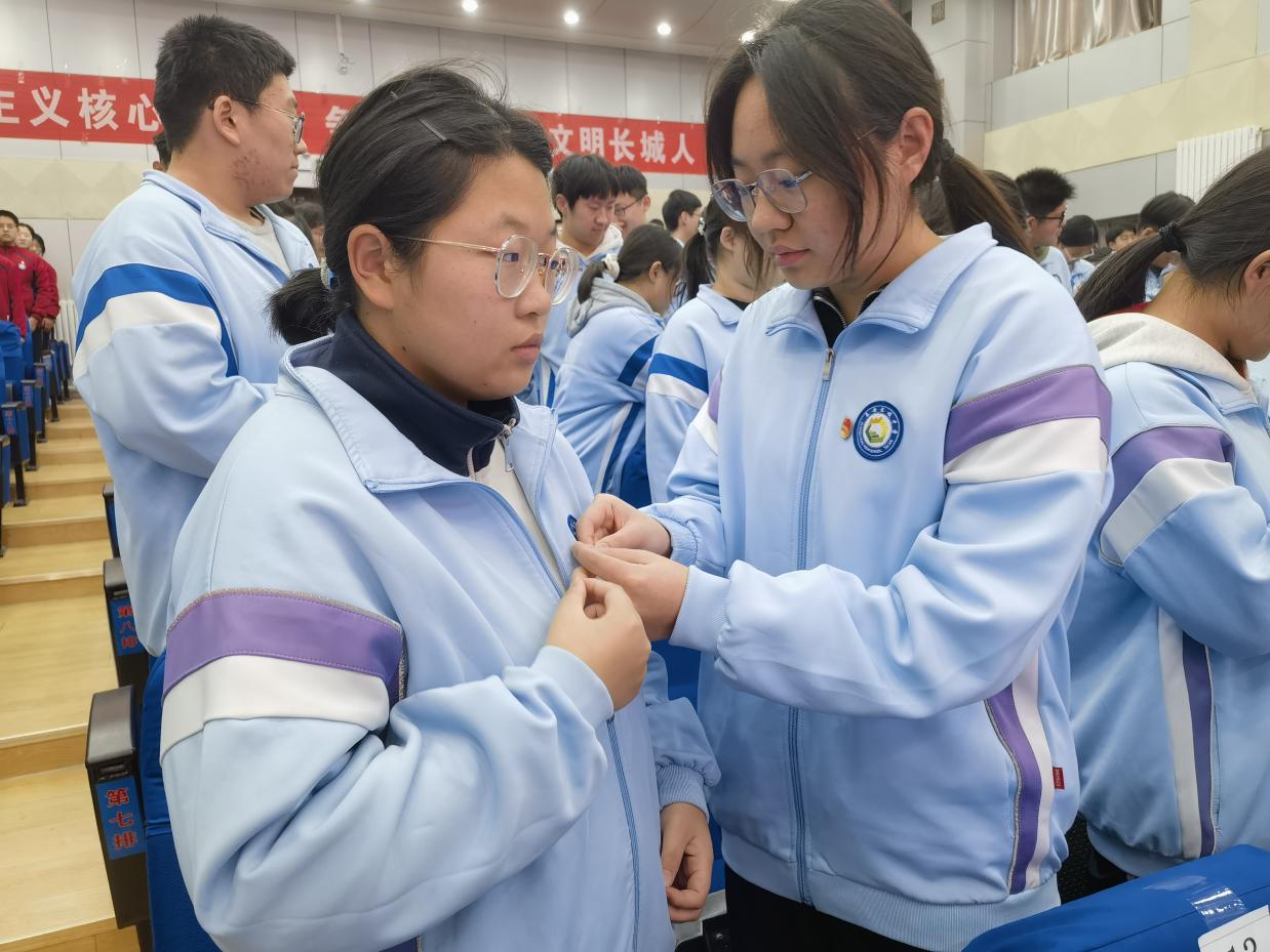 在庄重的团徽颁发环节,校领导、教师代表与老团员代表共同为新团员佩戴上熠熠生辉的团徽。这枚徽章不仅是中国共青团的象征,更承载着一份沉甸甸的责任,时刻提醒每一位团员牢记身份,朝着党指引的方向奋勇前进。