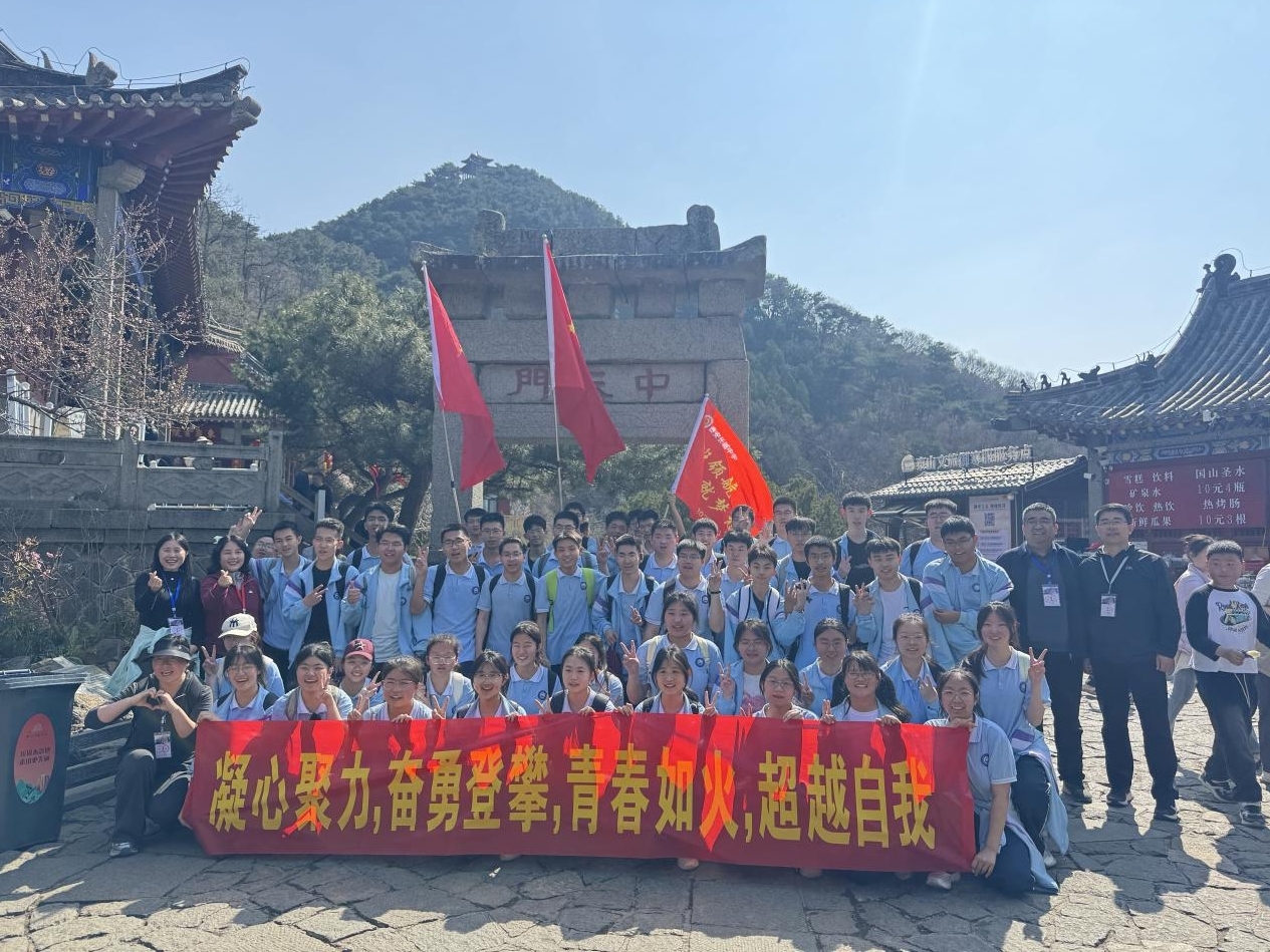 从红门启程,这场以“成长”为主题的攀登之路,处处皆是生动的教育课堂。一路向上,同学们在班主任、带队老师与家长志愿者的全程陪伴下奋勇前行,男生主动为同伴分担行囊,师生携手照料身体不适的同学,互帮互助的身影遍布整条登山道,筑起一道温暖的“移动长城”。南天门处,印着青春誓言的条幅迎风舒展,少年壮志与泰山雄浑气势交相辉映。最终,全体师生顺利登顶,在云海苍茫间,兑现了“会当凌绝顶”的豪迈誓言。