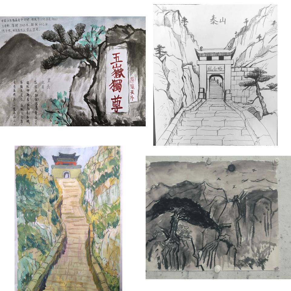 巍巍泰山,历来是丹青高手挥毫泼墨的圣地。元代王蒙作《岱宗密雪图》、明代叶澄绘《泰山图》、清代王翚绘《泰岳松风图》、清代华喦绘《泰岱云海图》、近现代徐悲鸿绘《泰山一角》,当代张志民作《中华泰山》……这些皆是泰山书画的杰出代表作。长城学子亦拿起画笔,发挥特长,以赤橙黄绿的色彩,讴歌家乡之美,描绘心中泰山。