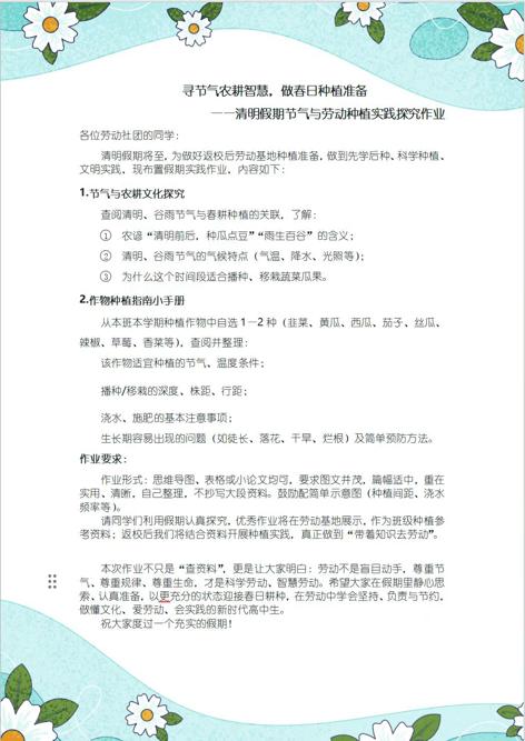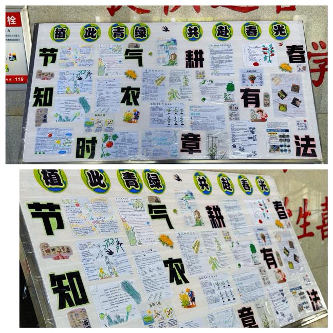 此次活动是学校落实“五育并举”育人方针的生动实践。清明假期期间,学校劳动社团成员紧扣劳动教育与德育、智育融合发展要求,完成了一系列特色探究任务:查阅二十四节气与春耕种植的内在关联,解读“清明前后,种瓜点豆”、“雨生百谷”等传统农谚,厚植农耕文化底蕴;针对各班即将种植的韭菜、黄瓜、茄子、丝瓜、草莓、辣椒、生菜等作物,精心整理科学种植及养护指南,以智育赋能劳动实践,为实操打下坚实基础。假期结束后,学校以“不负春光,植此青绿”为主题打造专题展板,分设“节气知农时”“春耕有章法”两大板块,集中展示优秀探究成果,进一步为实地种植筑牢理论根基。